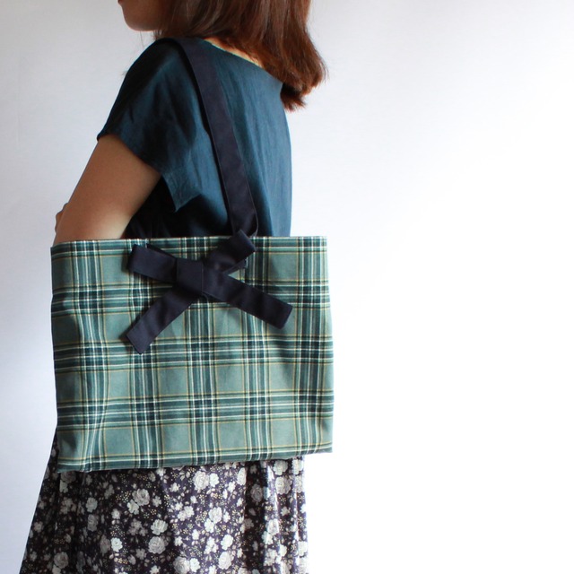 《秋冬のぬくもりを感じる!》 おしゃれなタータンチェック! スモーキーカラーのタータンチェックに、リボンモチーフを合わせて、大人かわいいデザインに♪ 表地、持ち手(裏地)の色合わせが、秋冬カラーでとってもおしゃれです◎ ---------- 【身に添う、中身に添う質感】 入れ口は芯地を貼って少ししっかりめにしつつ、本体はくったりとした質感にして使いやすくしました。 表地、裏地ともにオックス生地を使用していて、全体的にかっちりし過ぎず、くたくたし過ぎず、ちょうどいい厚みになっています! ---------- 【大き過ぎず、小さ過ぎないサイズ感】 財布、スマホ、折り畳み傘、ミニポーチ、A4ファイル… 必要なものはしっかり入ってちょうどいい大きさです! ---------- 【持ち手は長さ調整が可能】 肩掛けにしたり、手提げにしたり… 用途やお好みに合わせてアレンジができます♪ ---------- ■ カラー/サイズ/ ・タータンチェック(ブルーグリーン) ・持ち手、裏地(ミッドナイト) ・サイズ:タテ 27cm×ヨコ 37cm  (A4ファイルが入るサイズです) (モデル:身長155cm) ■ 素材/製造国 ・綿100%(オックス生地) ・日本(ハンドメイドで、1点1点丁寧に作成) ■ お手入れ/取り扱い注意事項 ・持ち手は、使用を重ねると、多少しわになってよれてくることがあります。そのままでもご使用になれますが、取り外してアイロンかけることも可能です。 ・アイロンは低温またはあて布を使用してください。 ■ 発送・注文に関する情報や注意事項 ・ご注文から発送まで通常1〜3営業日を予定しています。 ・数量限定商品のため、在庫がなくなる場合があります。 ■ その他の情報や注意事項 ・お使いの機器の画面設定や、お部屋の照明、日光等の環境などによって、実物の色味と異なって見える場合があります。 ・商品によって、柄の位置が多少異なる可能性があります。 あらかじめご了承の上、お買い求めください。