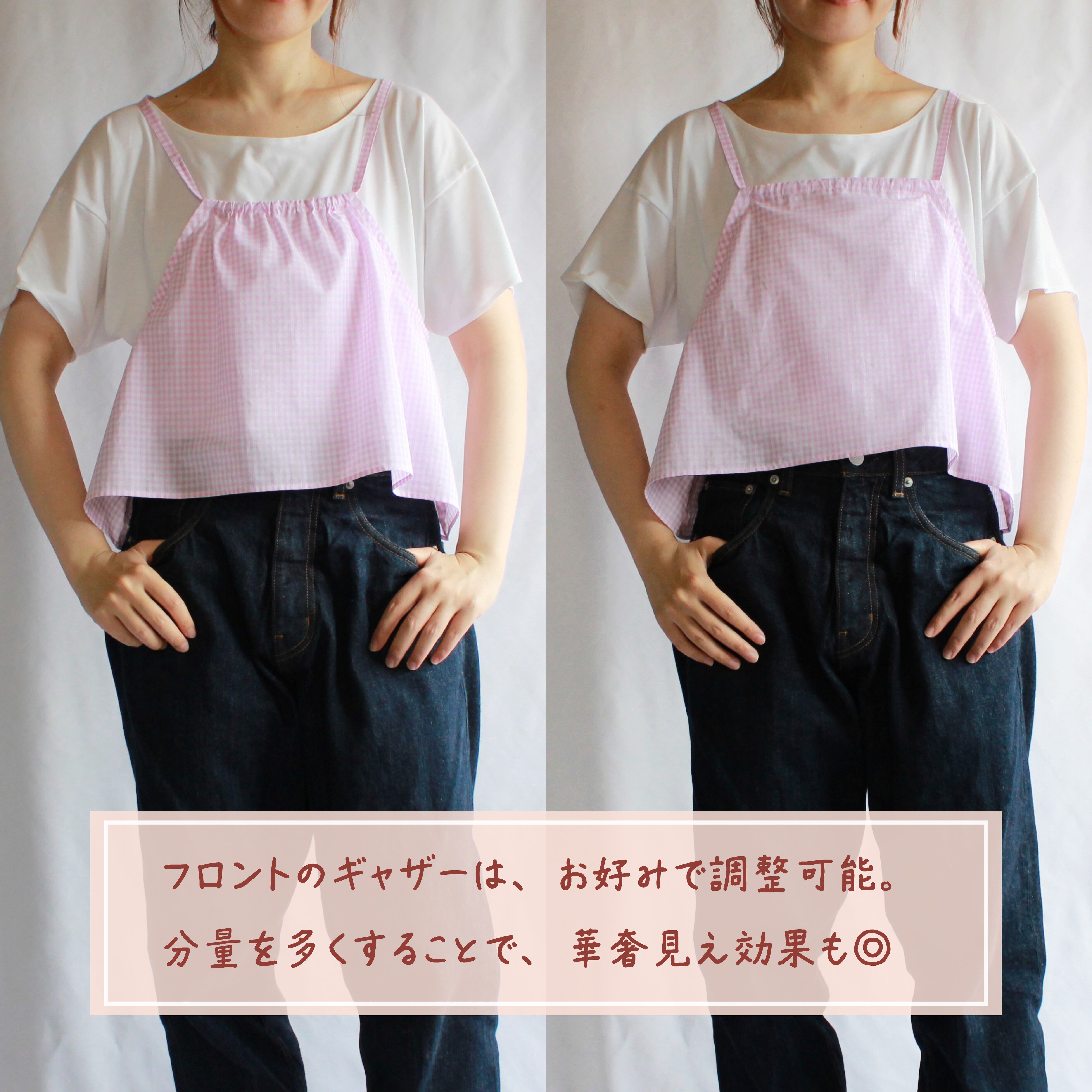 肩ひもは調整可能で、自分好みのフィット感を楽しむことができ、合わせるパンツやスカートは、ミニ丈にもロング丈にもマッチします!